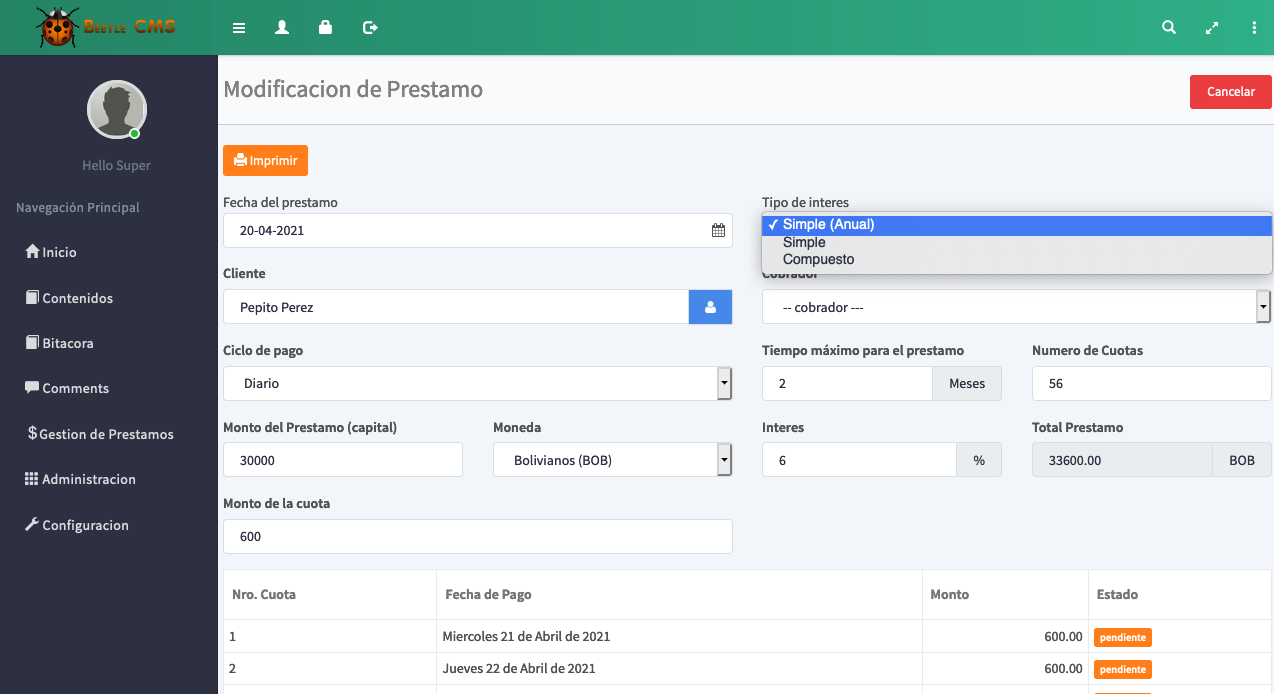 Nuestro sistema le ofrece un software de créditos y cobranzas diseñado especialmente para los prestamistas independientes con Pagos en Cuotas Diarias, Interdiario, Semanales, Quincenales y Mensuales y ademas de poder asignar los intereses por cada prestamo.